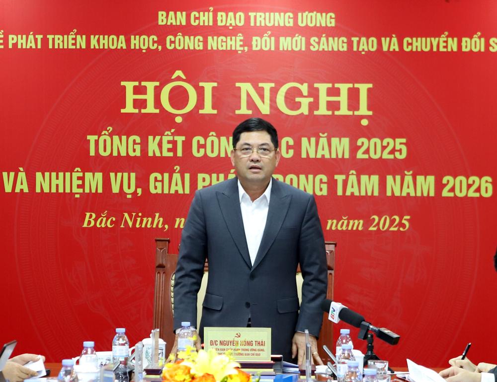 BẮC NINH - Sáng 25/12, tại Trụ sở Trung ương Đảng, Ban Chỉ đạo Trung ương về phát triển khoa học, công nghệ, đổi mới sáng tạo và chuyển đổi số tổ chức tổng kết công tác năm 2025; triển khai nhiệm vụ, giải pháp trọng tâm năm 2026 theo hình thức trực tiếp và trực tuyến tới các điểm cầu. Tổng Bí thư Tô Lâm, Trưởng Ban Chỉ đạo Trung ương chủ trì hội nghị.