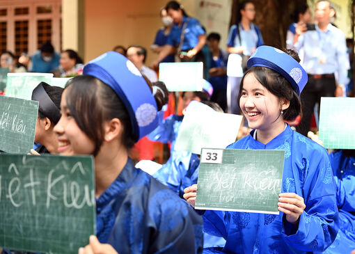 Học sinh trải nghiệm khoa thi Minh kinh bác học xưa tại Bảo tàng tỉnh. Ảnh: PHẠM HIẾU