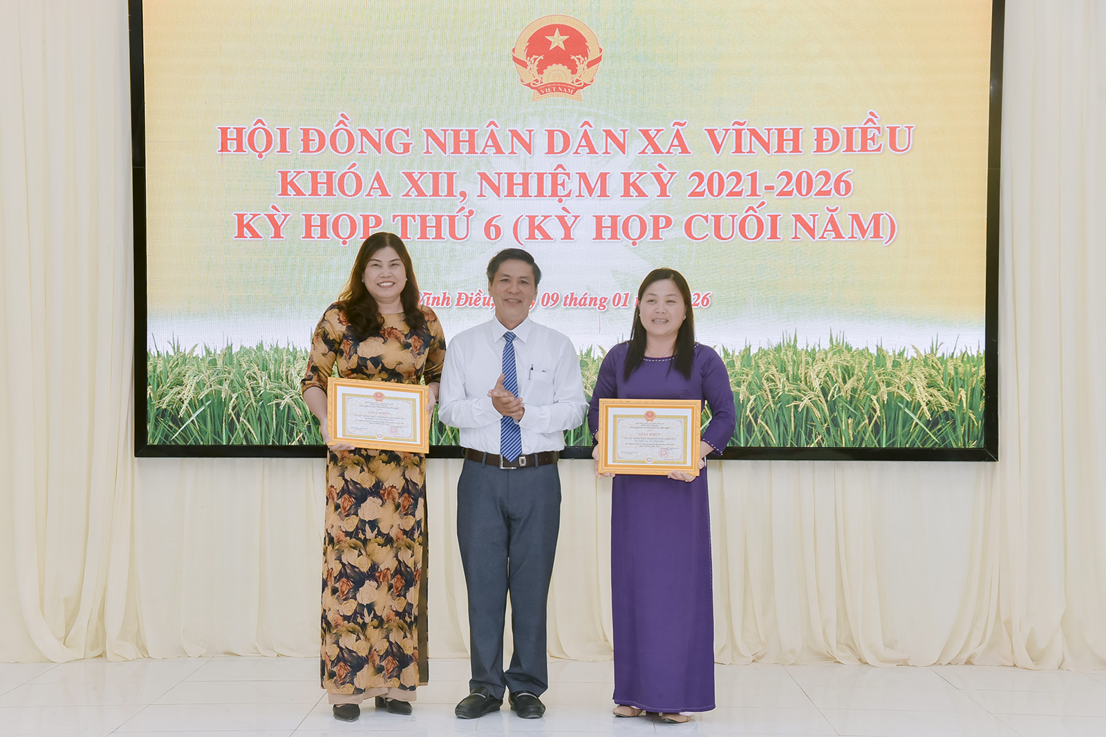 Dịp này, Chủ tịch UBND xã Vĩnh Điều tặng giấy khen 2 tập thể, 12 cá nhân có thành tích xuất sắc trong hoạt động HĐND xã Vĩnh Điều khóa XII, nhiệm kỳ 2021 - 2026.