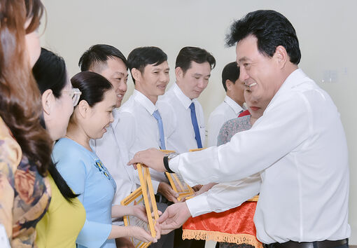 Phó Bí thư Thường trực Đảng ủy, Chủ tịch HĐND xã Vĩnh Điều Huỳnh Thiện Khoa (giữa) trao giấy khen cho đại diện các tập thể hoàn thành xuất sắc hoạt động HĐND trong nhiệm kỳ.