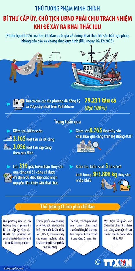 Phát biểu tại Phiên họp lần thứ 26 của Ban Chỉ đạo Quốc gia về chống khai thác hải sản bất hợp pháp, không báo cáo và không theo quy định (IUU) diễn ra tối 16/12/2025, Thủ tướng Chính phủ Phạm Minh Chính đánh giá cao các bộ, ngành, địa phương đã tích cực vào cuộc và đạt kết quả rõ rệt trong chống khai thác IUU.