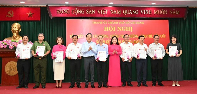 Bí thư Thành ủy TPHCM Trần Lưu Quang cùng Trưởng Ban Nội chính Thành ủy TPHCM Nguyễn Thị Mỹ Hằng trao giải cho các tập thể xuất sắc. (Ảnh: SGGP)Sáng 11/11, Ban Chỉ đạo phòng, chống tham nhũng, lãng phí, tiêu cực TPHCM tổ chức Lễ trao giải Báo chí về công tác phòng, chống tham nhũng, lãng phí, tiêu cực TPHCM năm 2024 - 2025.