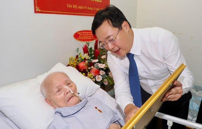 Đồng chí Lê Quốc Phong ân cần thăm hỏi đồng chí Nguyễn Duy Anh. (Ảnh: SGGP)Chiều 3/11, Đảng ủy phường Tân Mỹ (TPHCM) tổ chức lễ trao tặng Huy hiệu 60 năm tuổi Đảng đợt ngày 7/11/2025 đến đồng chí Nguyễn Duy Anh (đảng viên sinh hoạt tại chi bộ khu phố 28) tại nhà riêng.