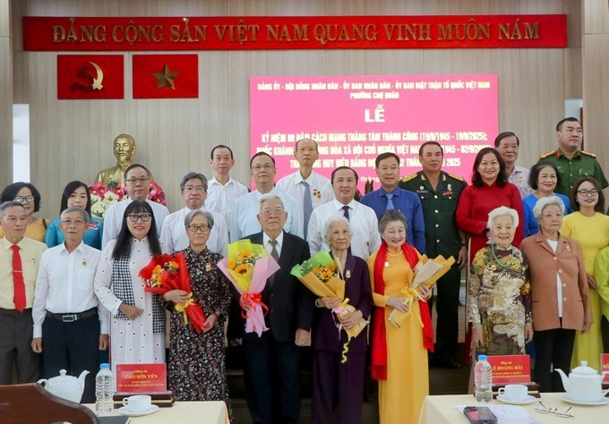 Đại biểu chụp hình lưu niệm tại buổi lễSáng 28/8, Đảng ủy – HĐND – UBND – Ủy ban MTTQ Việt Nam phường Chợ Quán (TPHCM) tổ chức Lễ kỷ niệm 80 năm Cách mạng Tháng Tám thành công (19/8/1945 – 19/8/2025) và Quốc khánh nước Cộng hòa xã hội chủ nghĩa Việt Nam (2/9/1945 – 2/9/2025); đồng thời trao tặng Huy hiệu Đảng đợt 2/9 cho các đảng viên tiêu biểu.
