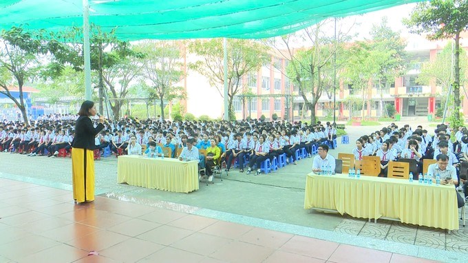 Từ đó, TS Phan Thị Cẩm Giang hướng dẫn cho hơn 1.000 học sinh cách bảo vệ bản thân khi gặp trường hợp bị kẻ xấu lợi dụng, những tình huống cấp bách; đồng thời nêu ra một số phương thức, thủ đoạn mới của tội phạm buôn bán người.
