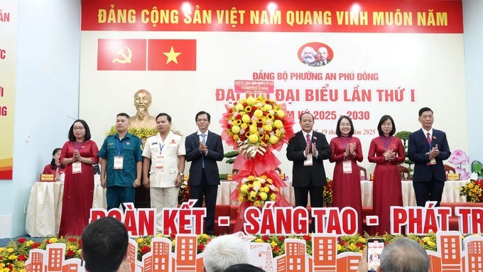 Đồng chí Dương Trọng Hiếu tặng hoa chúc mừng đại hội (Ảnh SGGP)Chiều 19/8, Đảng bộ phường An Phú Đông tổ chức Đại hội đại biểu lần thứ I, nhiệm kỳ 2025-2030.