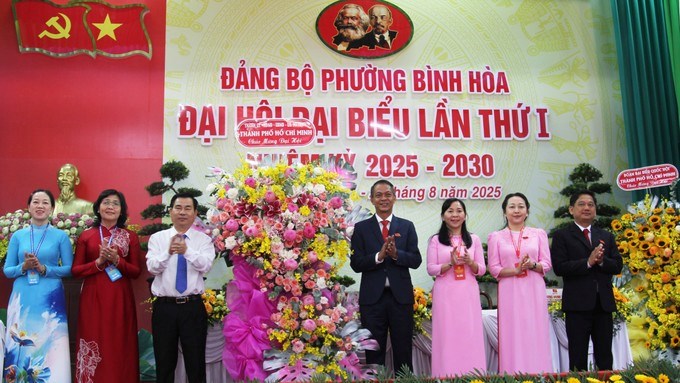 Đồng chí Nguyễn Văn Minh chúc mừng đại hội. (Ảnh: SGGP)Sáng 22/8, Đảng bộ phường Bình Hòa (TPHCM) tổ chức Đại hội đại biểu lần thứ I, nhiệm kỳ 2025-2030.
