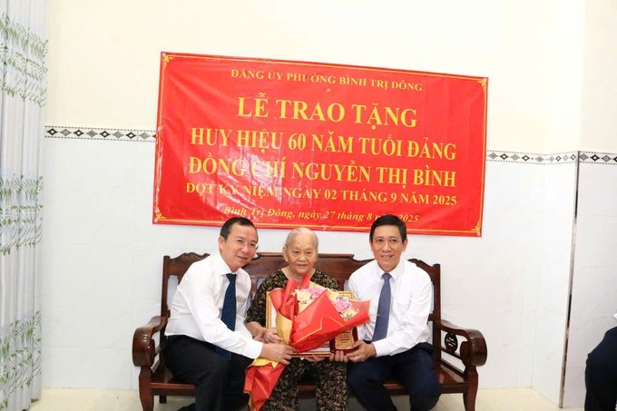 Phó Trưởng Ban Tổ chức Thành ủy TPHCM Đặng Quốc Toàn và Bí thư Đảng ủy, Chủ tịch HĐND phường Bình Trị Đông Trần Xuân Điền trao Huy hiệu 60 năm tuổi Đảng đến đồng chí Nguyễn Thị BìnhNgày 27/8, Đảng ủy - HĐND - UBND - Ủy ban MTTQ Việt Nam phường Bình Trị Đông (TPHCM) tổ chức lễ trao tặng Huy hiệu Đảng nhân kỷ niệm 80 năm Quốc khánh Nước Cộng hòa xã hội chủ nghĩa Việt Nam (2/9/1945 – 2/9-2025).