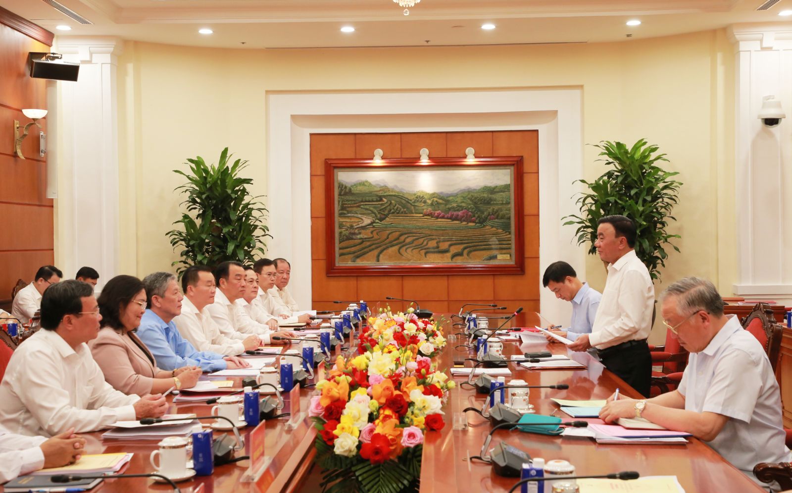 Các đồng chí Ủy viên Ban Thường vụ Tỉnh ủy Vĩnh Long tham dự cuộc làm việc.