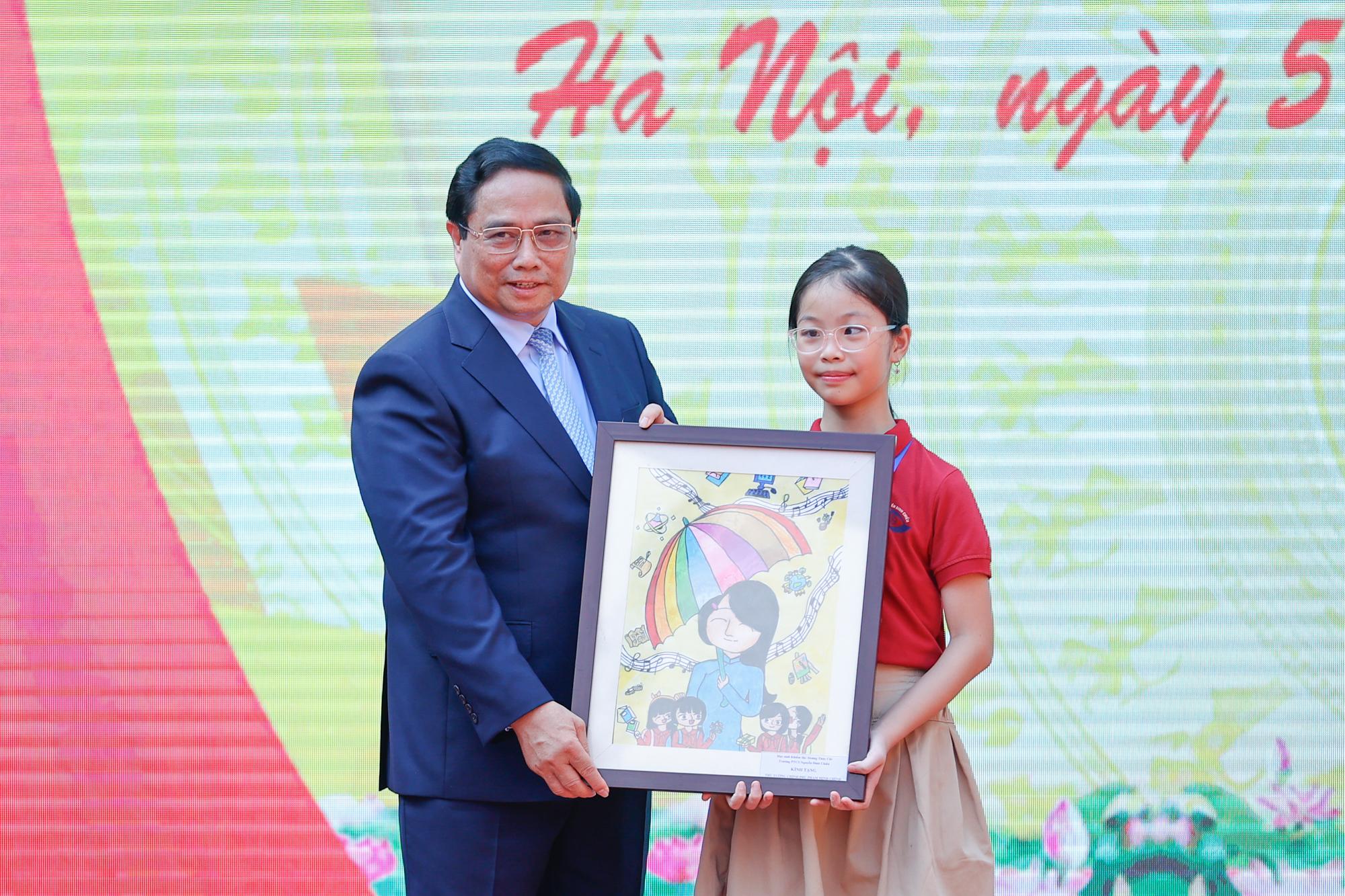Thủ tướng nhận bức tranh do học sinh trường Trường Phổ thông cơ sở Nguyễn Đình Chiểu tặng - Ảnh: VGP/Nhật Bắc