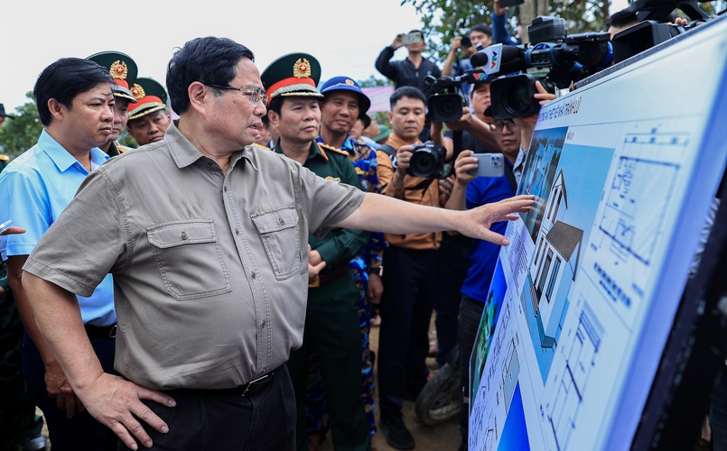 Thủ tướng Phạm Minh Chính nghe báo cáo về thiết kế nhà chống lũ - Ảnh: VGP/Nhật Bắc