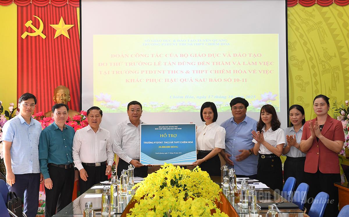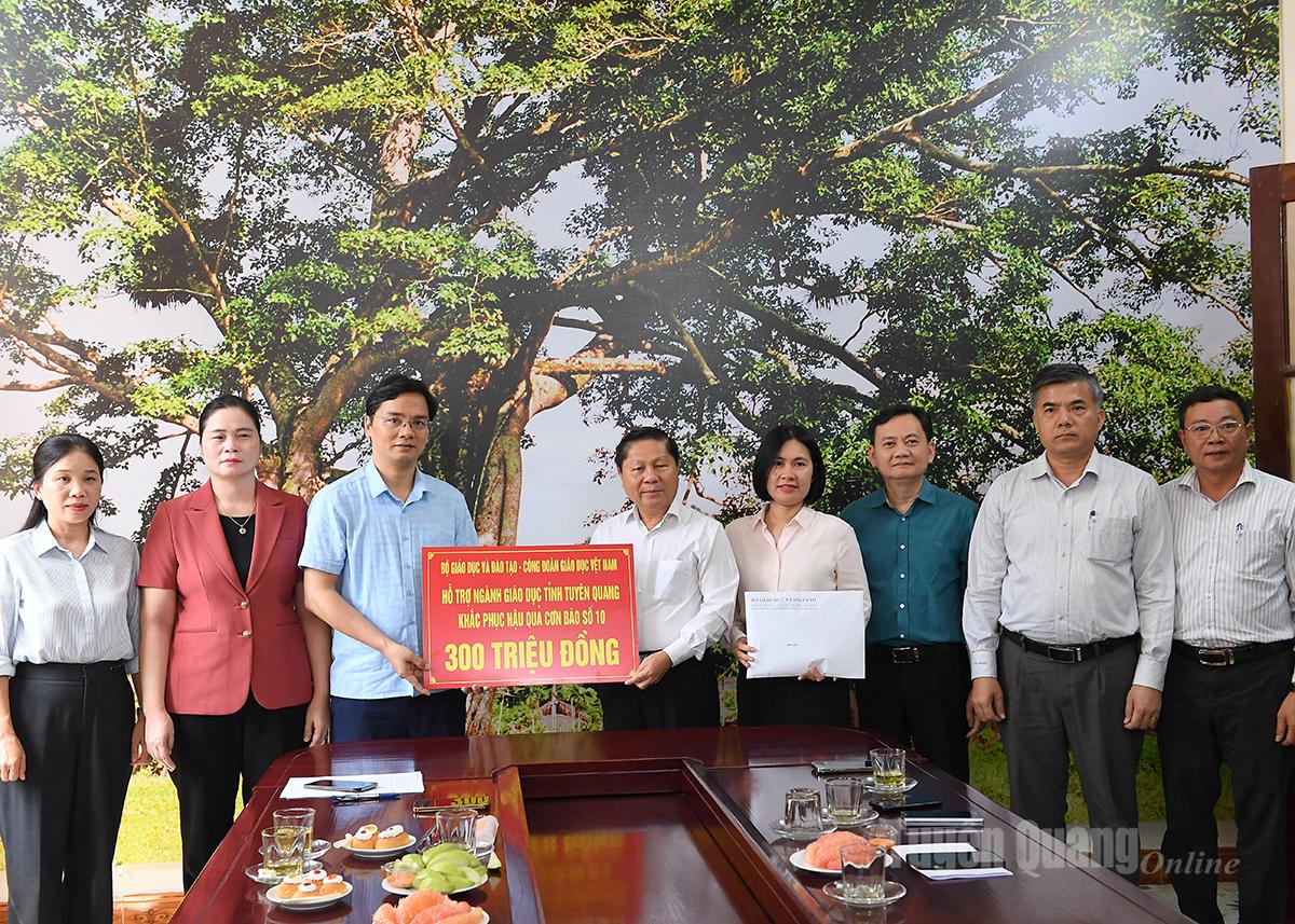 Thứ trưởng Bộ Giáo dục và Đào tạo Lê Tấn Dũng trao hỗ trợ của Bộ Giáo dục và Đào tạo, Công đoàn Giáo dục Việt Nam hỗ trợ ngành Giáo dục tỉnh Tuyên Quang khắc phục thiệt hại do cơn bão số 10 gây ra.