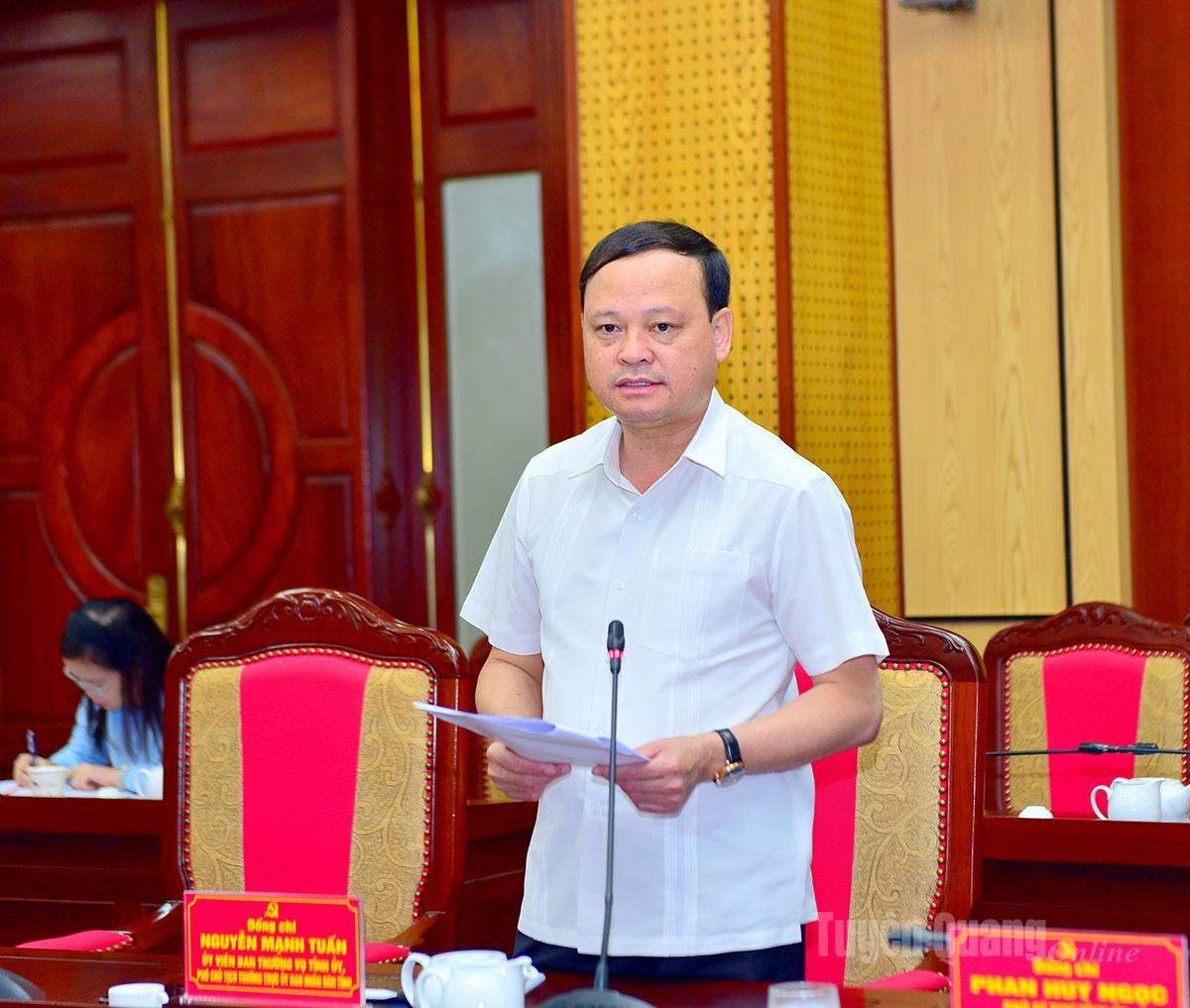 Đồng chí Phó Chủ tịch Thường trực UBND tỉnh Nguyễn Mạnh Tuấn trình bày tờ trình xin ý kiến thống nhất vị trí khu đất đầu tư xây dựng nhà ở cho lực lượng vũ trang nhân dân tại tổ 9, phường An Tường theo đề nghị của Bộ Công an.