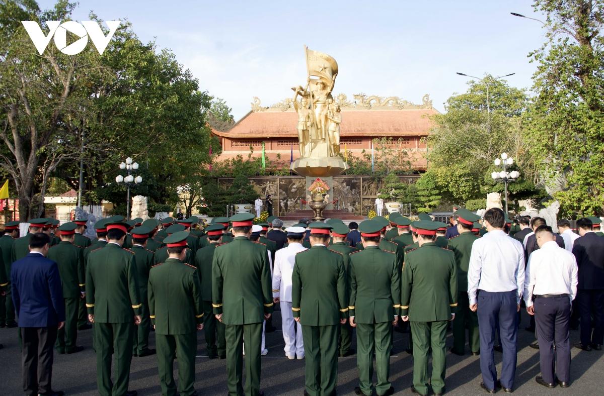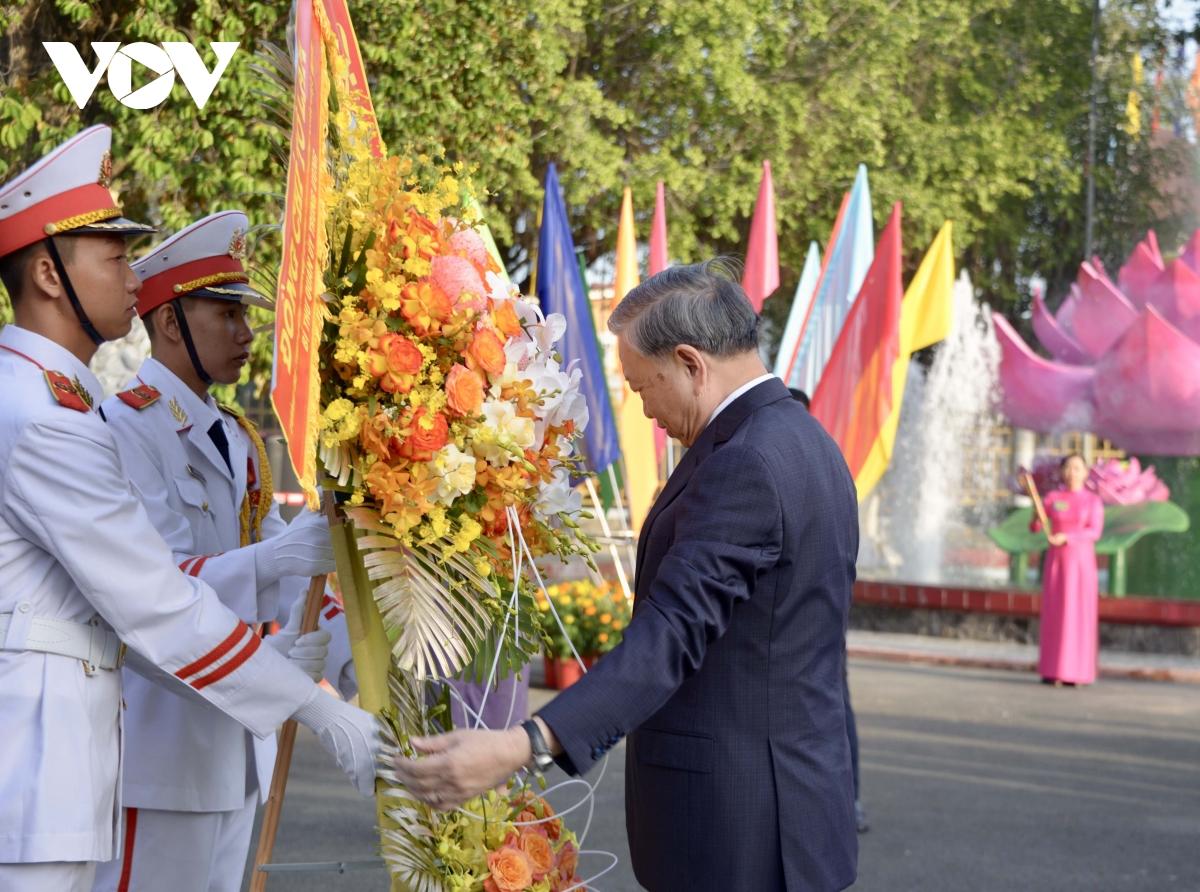 Đầu giờ sáng nay (8/12), trước khi tham dự lễ kỷ niệm, Tổng Bí thư Tô Lâm cùng đoàn công tác đã tới dâng hoa, dâng hương tại Nhà bia tưởng niệm các Anh hùng liệt sĩ; Tượng đài Chiến thắng và Nhà tưởng niệm Chủ tịch Hồ Chí Minh trong khuôn viên Quân khu 9.
