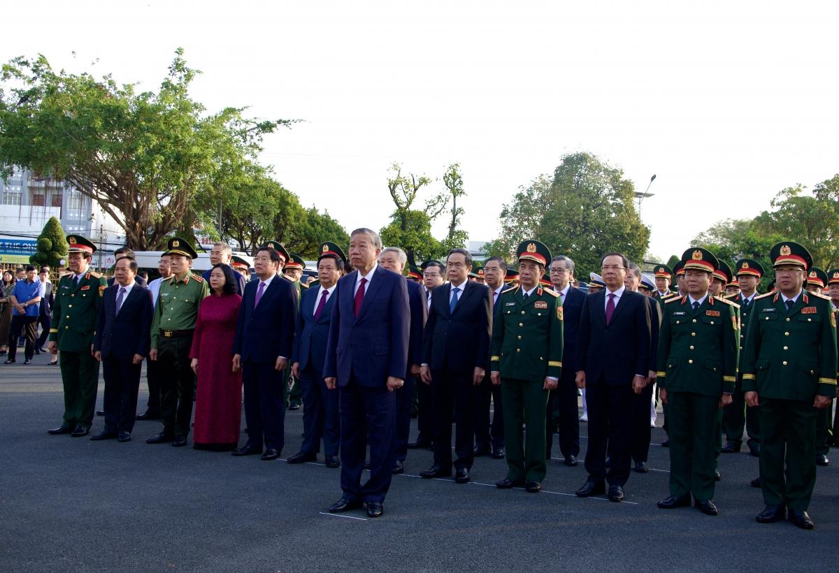 Trong không khí trang nghiêm, Tổng Bí thư cùng đoàn công tác và các đại biểu đã bày tỏ lòng thành kính, tưởng nhớ và tri ân đối với công lao to lớn của Chủ tịch Hồ Chí Minh vĩ đại và các anh hùng liệt sĩ.