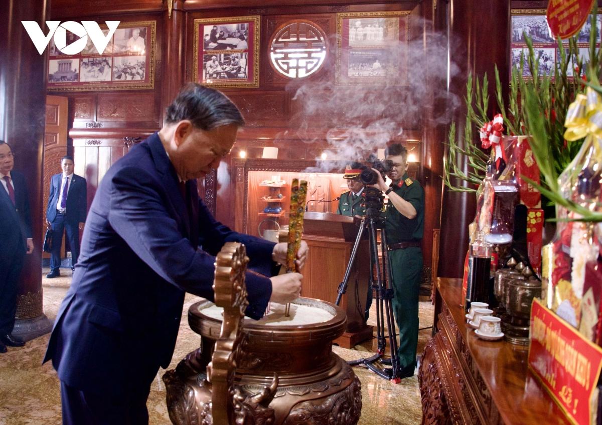 Tổng Bí thư Tô Lâm dâng hương tại Nhà tưởng niệm Chủ tịch Hồ Chí Minh trong khuôn viên Quân khu 9.