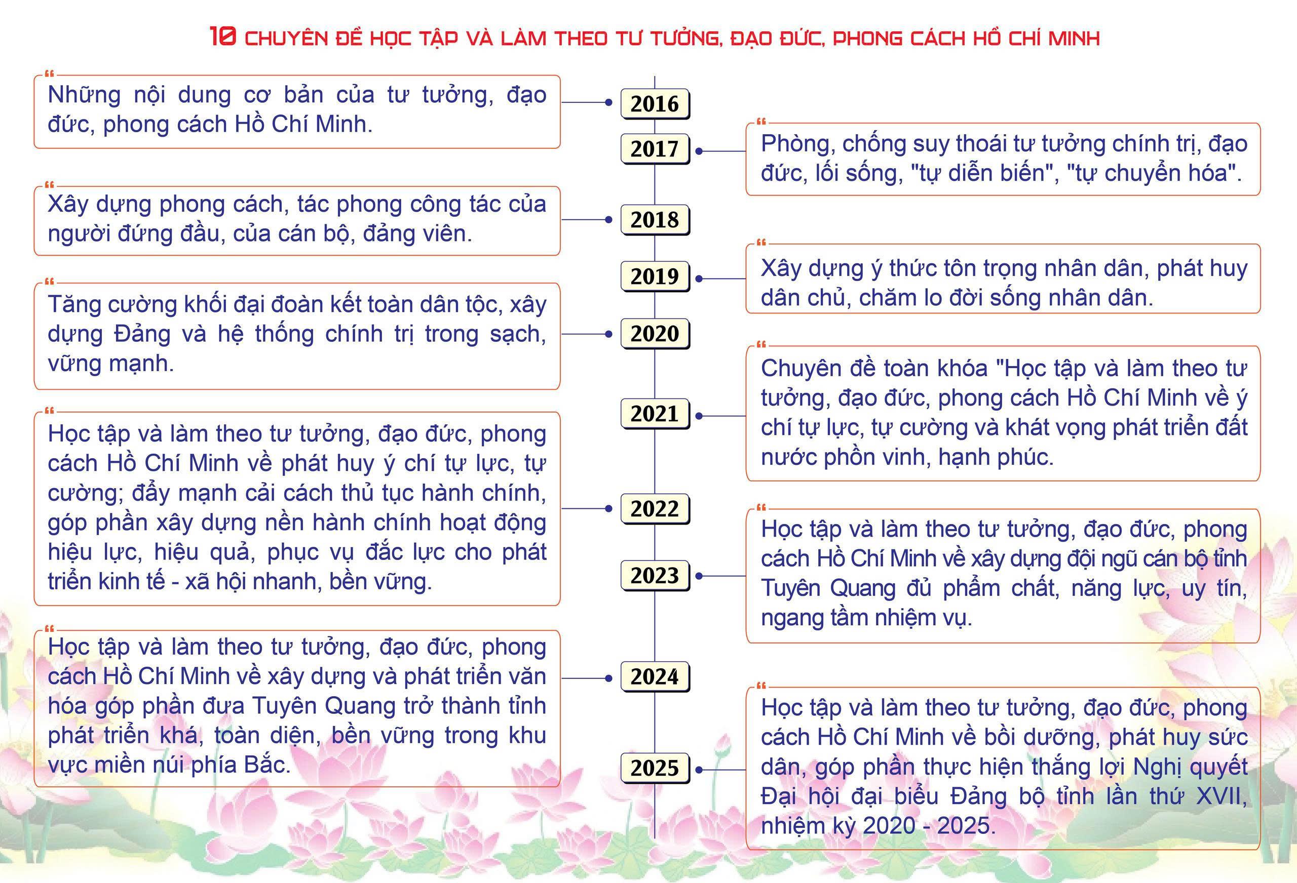 Việc nghiên cứu, quán triệt, triển khai Chỉ thị số 05-CT/TW, Kết luận số 01-KL/TWchuyên đề toàn khóa, chuyên đề hằng năm có nhiều đổi mới. Các cấp ủy, tổ chức đảng đã tổ chức triển khai, quán triệt tới cán bộ, đảng viên, công chức, viên chức, đoàn viên, hội viên và tuyên truyền trong Nhân dân đảm bảo kịp thời, hiệu quả, nâng cao chất lượng với nhiều hình thức phong phú, đa dạng như: tổ chức các hội nghị bằng hình thức trực tiếp kết hợp trực tuyến; truyền hình trực tiếp trên báo Tuyên Quang online; ghi video nội dung học tập, triển khai tại hội nghị cấp tỉnh để phục vụ nghiên cứu, tuyên truyền ở cơ sở… Từ năm 2016 đến 2025, toàn tỉnh đã triển khai 10 chuyên đề học tập và làm theo tư tưởng, đạo đức, phong cách Hồ Chí Minh; trong đó, 6 chuyên đề theo chỉ đạo của Trung ương, 4 chuyên đề do Ban Thường vụ Tỉnh ủy chỉ đạo biên soạn. Nội dung các chuyên đề đều gắn với nhiệm vụ chính trị thực hiện Nghị quyết Đại hội đại biểu Đảng bộ tỉnh lần thứ XVII.