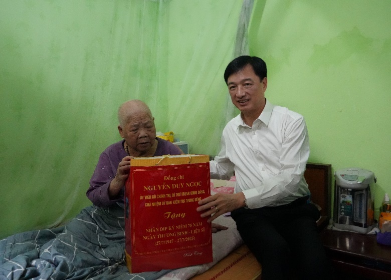 Đồng chí Nguyễn Duy Ngọc, Ủy viên Bộ Chính trị, Bí thư Trung ương Đảng, Chủ nhiệm Ủy ban Kiểm tra Trung ương tặng quà Mẹ Việt Nam anh hùng Nguyễn Thị Kim.
