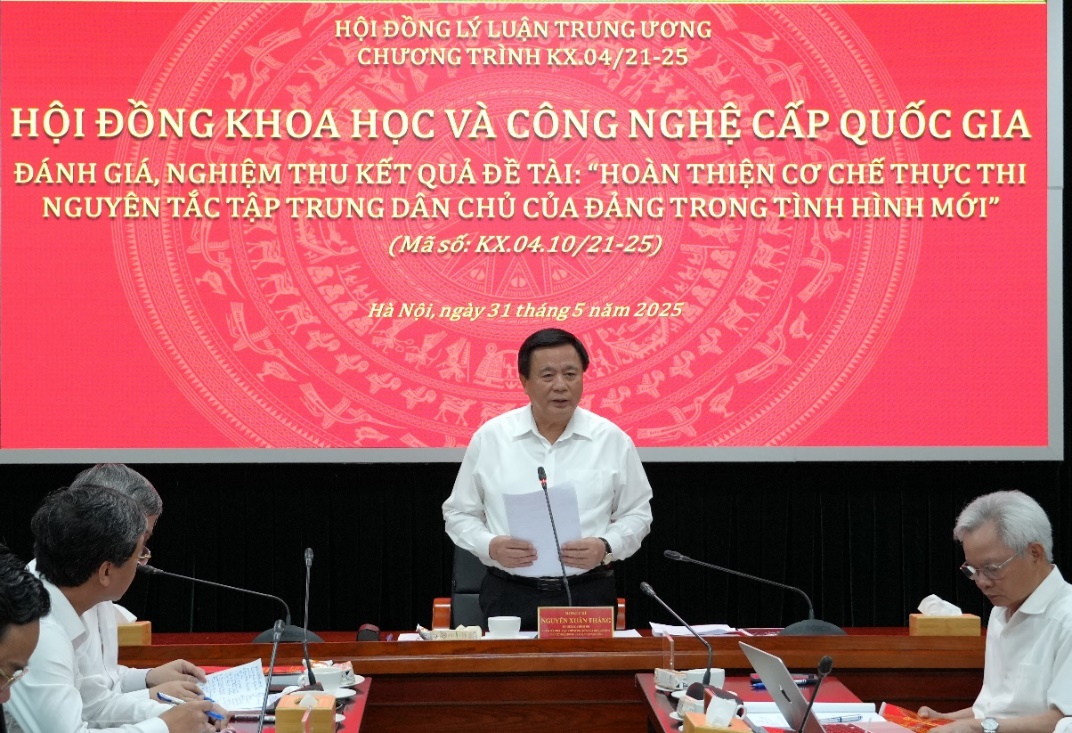 Sáng 31/5/2025, tại Học viện Chính trị quốc gia Hồ Chí Minh, Hội đồng Lý luận Trung ương tổ chức Hội nghị nghiệm thu cấp quốc gia Đề tài khoa học cấp Nhà nước “Hoàn thiện cơ chế thực thi nguyên tắc tập trung dân chủ của Đảng trong tình hình mới”, mã số KX.04.10/21-25 do Ủy ban Kiểm tra Trung ương là Cơ quan chủ trì và đồng chí Trần Tiến Hưng, Ủy viên Trung ương Đảng, Phó Chủ nhiệm Ủy ban Kiểm tra Trung ương làm Chủ nhiệm Đề tài. GS.TS Nguyễn Xuân Thắng, Ủy viên Bộ Chính trị, Giám đốc Học viện Chính trị quốc gia Hồ Chí Minh, Chủ tịch Hội đồng Lý luận Trung ương làm Chủ tịch Hội đồng nghiệm thu.