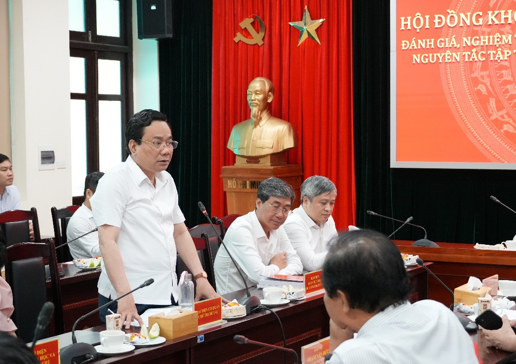 Tại Hội nghị, Ban Chủ nhiệm Đề tài đã nghe và tiếp thu ý kiến của các đồng chí phản biện và Ủy viên Hội đồng nghiệm thu. Các ý kiến thống nhất Đề tài đã làm nổi bật những vấn đề lý luận và thực tiễn trong cơ chế thực thi nguyên tắc tập trung dân chủ trong Đảng, góp phần bổ sung, hoàn thiện quan điểm của Đảng về nguyên tắc tập trung dân chủ. Công trình được nghiên cứu công phu, nghiêm túc, phương pháp nghiên cứu phù hợp, các sản phẩm khoa học bảo đảm chất lượng, đúng tiến độ, hoàn thành đầy đủ, vượt mức mục tiêu nghiên cứu, có đóng góp rõ rệt về mặt khoa học, có tính thực tiễn cao, đáp ứng yêu cầu của tình hình mới. Một số ý kiến đóng góp đề nghị Ban Chủ nhiệm Đề tài làm rõ nội hàm của một số thuật ngữ và đưa ra thêm giải pháp đột phá liên quan đến xây dựng thể chế, cơ chế thực thi nguyên tắc tập trung dân chủ trong Đảng...