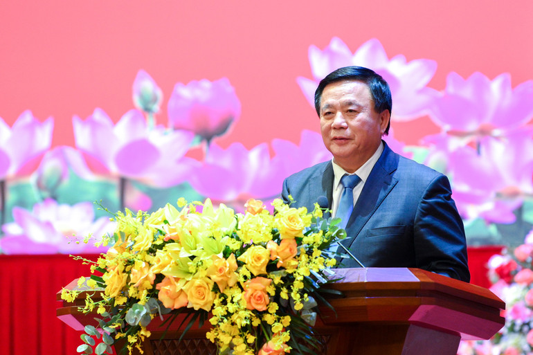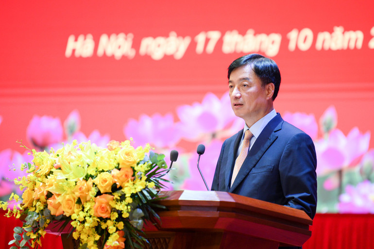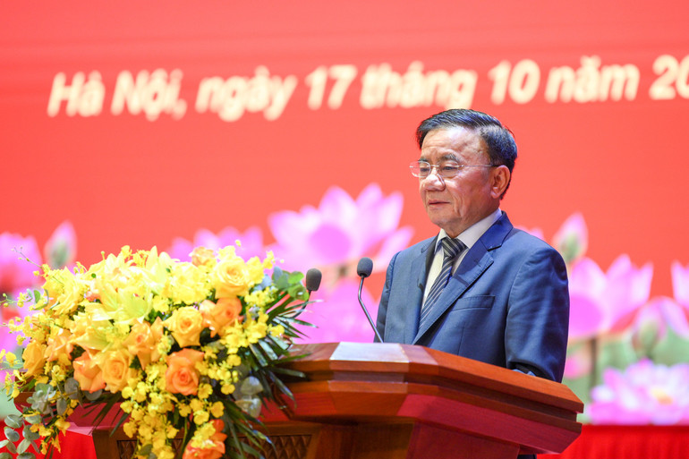 Đồng chí Nguyễn Xuân Thắng, Ủy viên Bộ Chính trị, Giám đốc Học viện Chính trị quốc gia Hồ Chí Minh, Chủ tịch Hội đồng Lý luận Trung ương phát biểu tại buổi lễ.