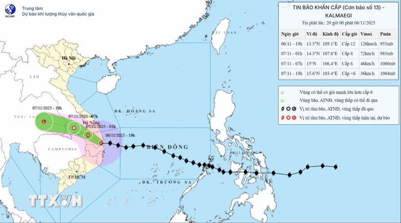 Hồi 20h ngày 6/11, tâm bão số 13 ở vào khoảng 13,5°N; 109,1°E, trên đất liền ven biển tỉnh Gia Lai-Đắk Lắk, sức gió mạnh nhất: cấp 12 (118–133 km/h), giật cấp 14, di chuyển hướng Tây Tây Bắc.