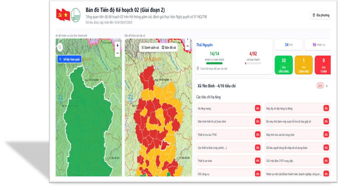 Dữ liệu thu thập từ 3.321 xã, phường thuộc 34 tỉnh, thành phố cùng dữ liệu hiển thị bản đồ số của Cục Đo đạc, Bản đồ và Thông tin địa lý Việt Nam cho thấy một bức tranh tổng thể: Đó là việc triển khai Kế hoạch 02 ngày 19/6/2025 của Ban Chỉ đạo Trung ương về phát triển khoa học, công nghệ, đổi mới sáng tạo và chuyển đổi số về thúc đẩy chuyển đổi số liên thông, đồng bộ, nhanh, hiệu quả đáp ứng yêu cầu sắp xếp tổ chức bộ máy của hệ thống chính trị diễn ra chủ động, đồng đều và mang tính hệ thống.
