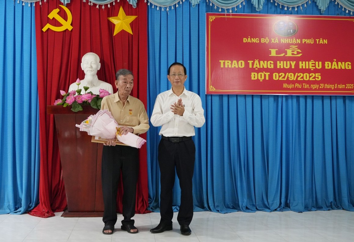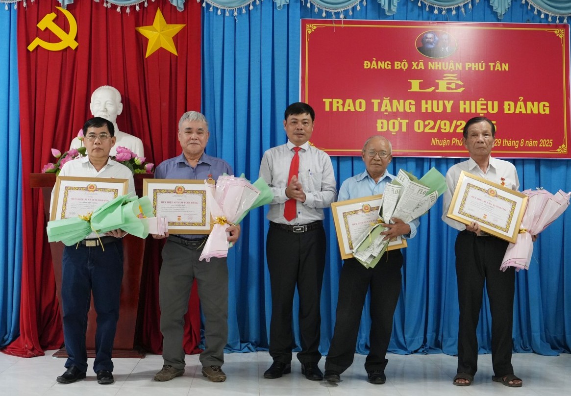 Đợt này, Đảng bộ xã Nhuận Phú Tân có 8 đồng chí được trao Huy hiệu Đảng (01 đồng chí 60 năm tuổi Đảng, 01 đồng chí 50 năm tuổi Đảng, 03 đồng chí 45 năm tuổi Đảng, 01 đồng chí 40 năm tuổi Đảng và 01 đồng chí 30 năm tuổi Đảng).