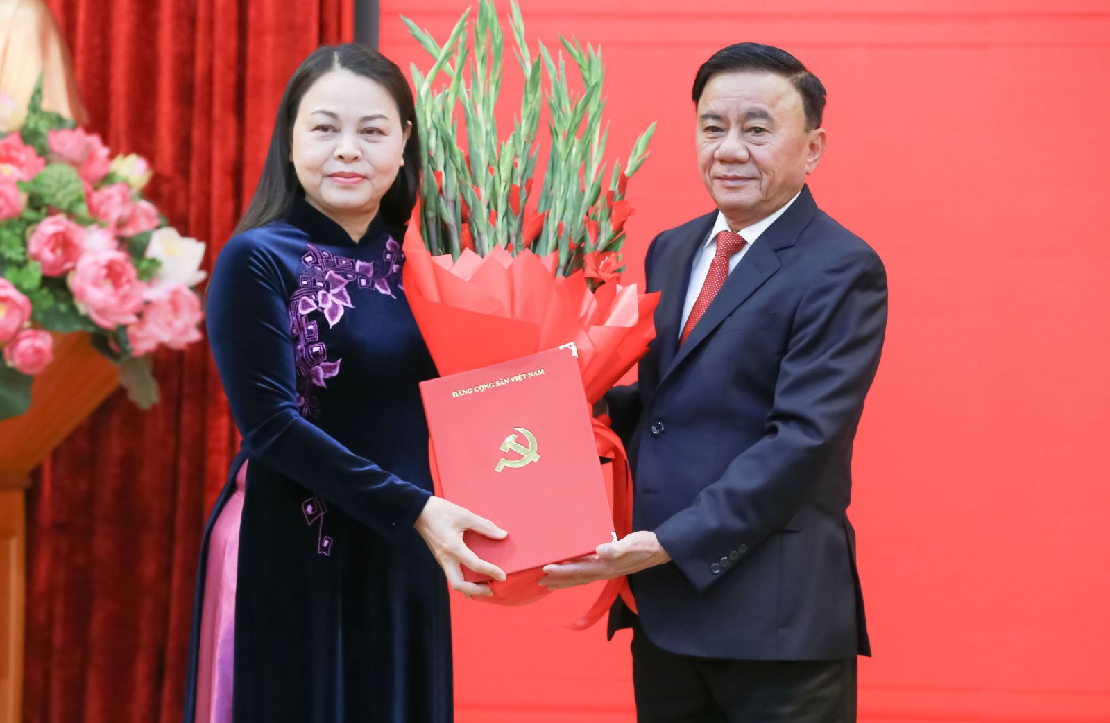 Đồng chí Thường trực Ban Bí thư Trần Cẩm Tú trao Quyết định của Bộ Chính trị và tặng hoa chúc mừng đồng chí Nguyễn Thị Thu Hà.