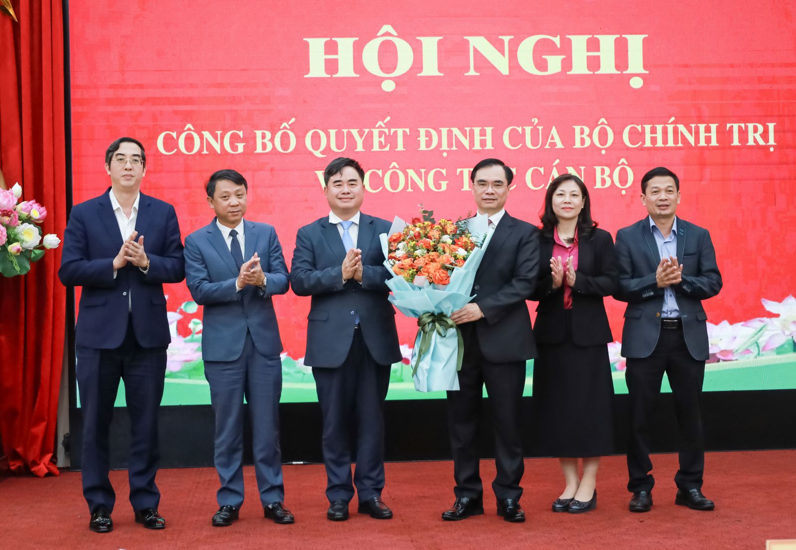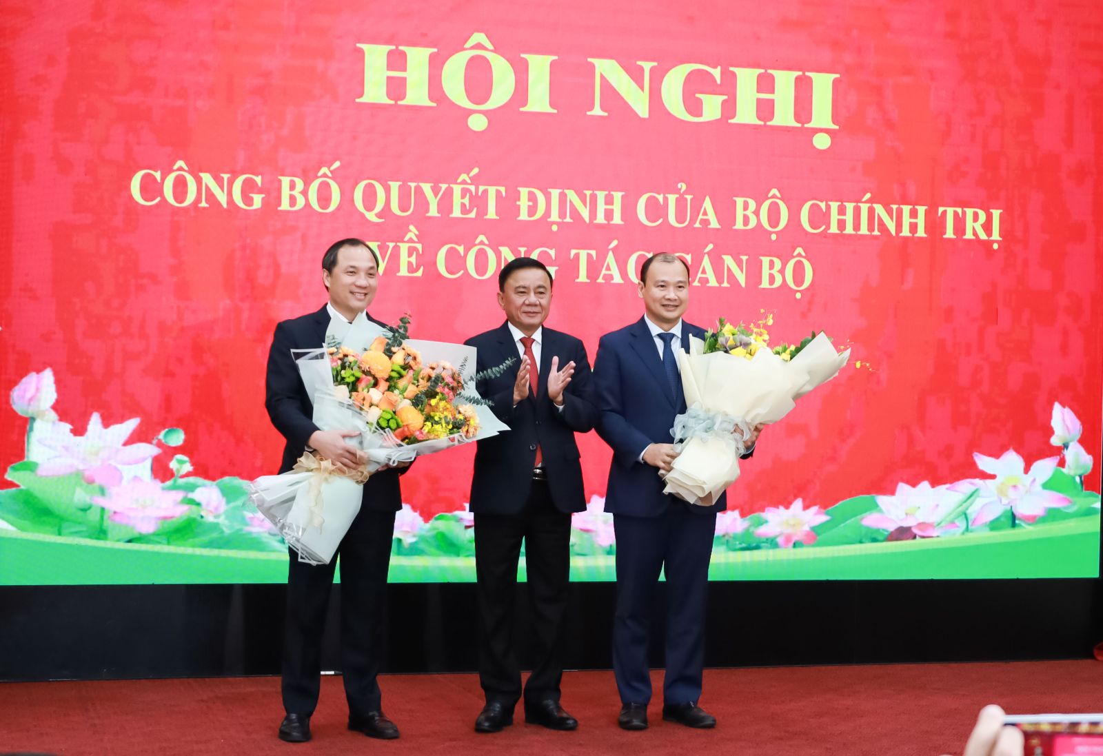 Đồng chí Thường trực Ban Bí thư Trần Cẩm Tú tặng hoa chúc mừng đồng chí Hoàng Trung Dũng và đồng chí Lê Hải Bình.