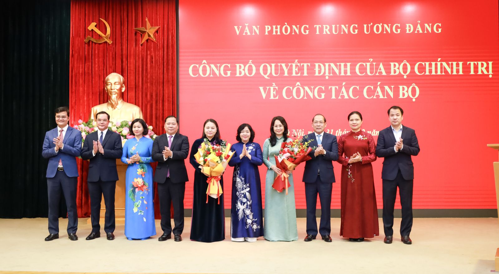 Các đồng chí lãnh đạo Văn phòng Trung ương Đảng, lãnh đạo Đảng ủy các cơ quan Đảng Trung ương tặng hoa chúc mừng đồng chí Nguyễn Thị Thu Hà và đồng chí Lâm Thị Phương Thanh.