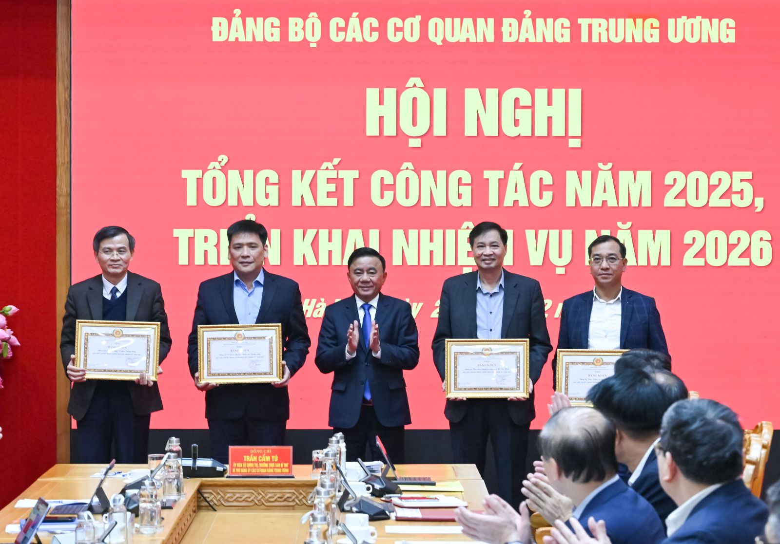Đồng chí Trần Cẩm Tú, Ủy viên Bộ Chính trị, Thường trực Ban Bí thư, Bí thư Đảng ủy các cơ quan Đảng Trung ương trao Bằng khen tặng các Đảng bộ trực thuộc hoàn thành xuất sắc nhiệm vụ năm 2025.