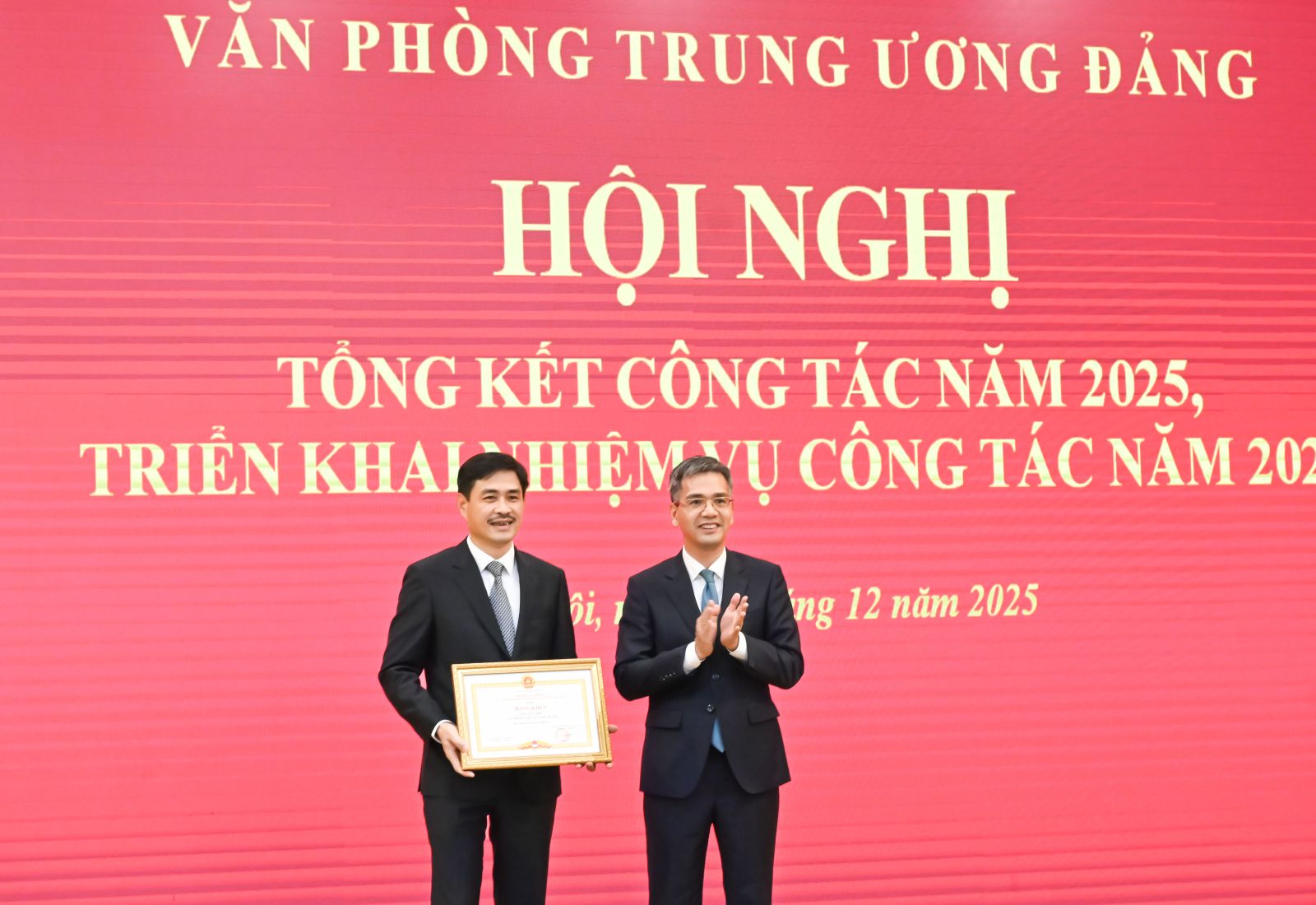 Đồng chí Võ Thành Hưng, Phó Chánh Văn phòng Trung ương Đảng trao tặng Bằng khen của Chánh Văn phòng Trung ương Đảng cho các tập thể.