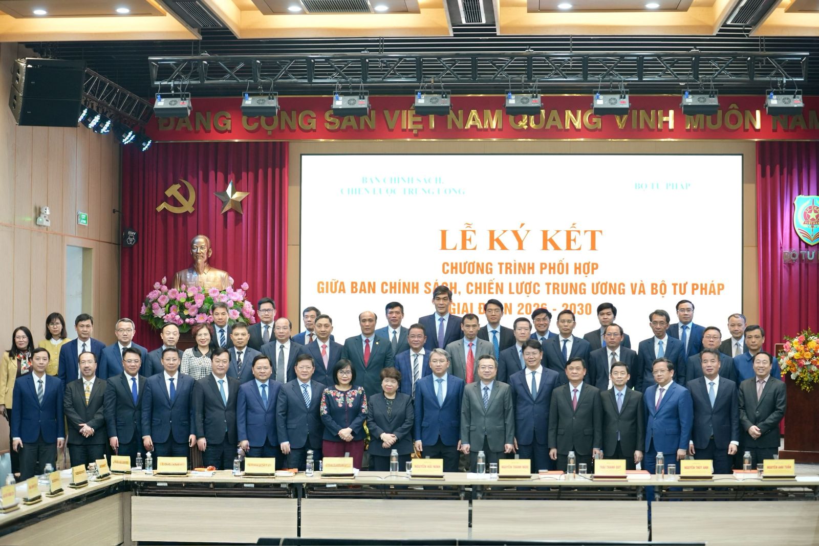 Theo Chương trình ký kết, Ban Chính sách, chiến lược Trung ương và Bộ Tư pháp sẽ phối hợp chặt chẽ, nâng cao hiệu quả công tác nghiên cứu, tham mưu, giúp việc Ban Chấp hành Trung ương Đảng, Bộ Chính trị, Ban Bí thư trong việc lãnh đạo, chỉ đạo xây dựng, hoàn thiện thể chế, pháp luật về phát triển kinh tế - xã hội của đất nước; bảo đảm thể chế hóa đầy đủ, kịp thời các chủ trương, đường lối của Đảng trong Văn kiện Đại hội đại biểu toàn quốc lần thứ XIV của Đảng, các Nghị quyết, Chỉ thị, Kết luận của Ban Chấp hành Trung ương, Bộ Chính trị, Ban Bí thư về phát triển đất nước, tăng trưởng “hai con số” và 2 mục tiêu 100 năm của đất nước, nhất là các chủ trương, định hướng chiến lược do Ban Chính sách, chiến lược Trung ương và Bộ Tư pháp tham mưu.
