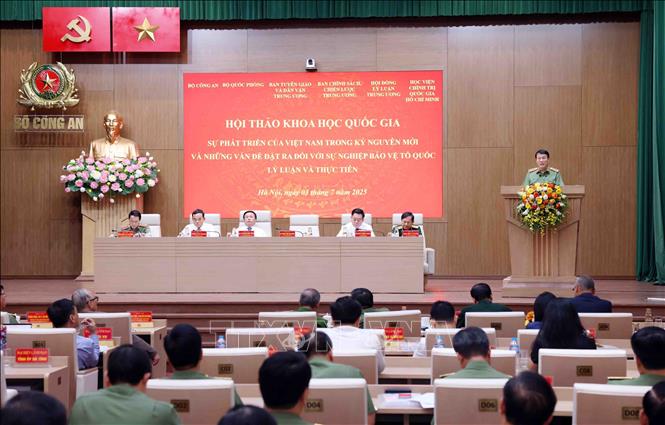 Chiều 3/7, tại Hà Nội, Bộ Công an phối hợp với Bộ Quốc phòng, Ban Tuyên giáo và Dân vận Trung ương, Ban Chính sách, Chiến lược Trung ương, Hội đồng Lý luận Trung ương, Học viện Chính trị Quốc gia Hồ Chí Minh tổ chức Hội thảo khoa học quốc gia "Sự phát triển của Việt Nam trong kỷ nguyên mới và những vấn đề đặt ra đối với sự nghiệp bảo vệ Tổ quốc - Lý luận và thực tiễn".