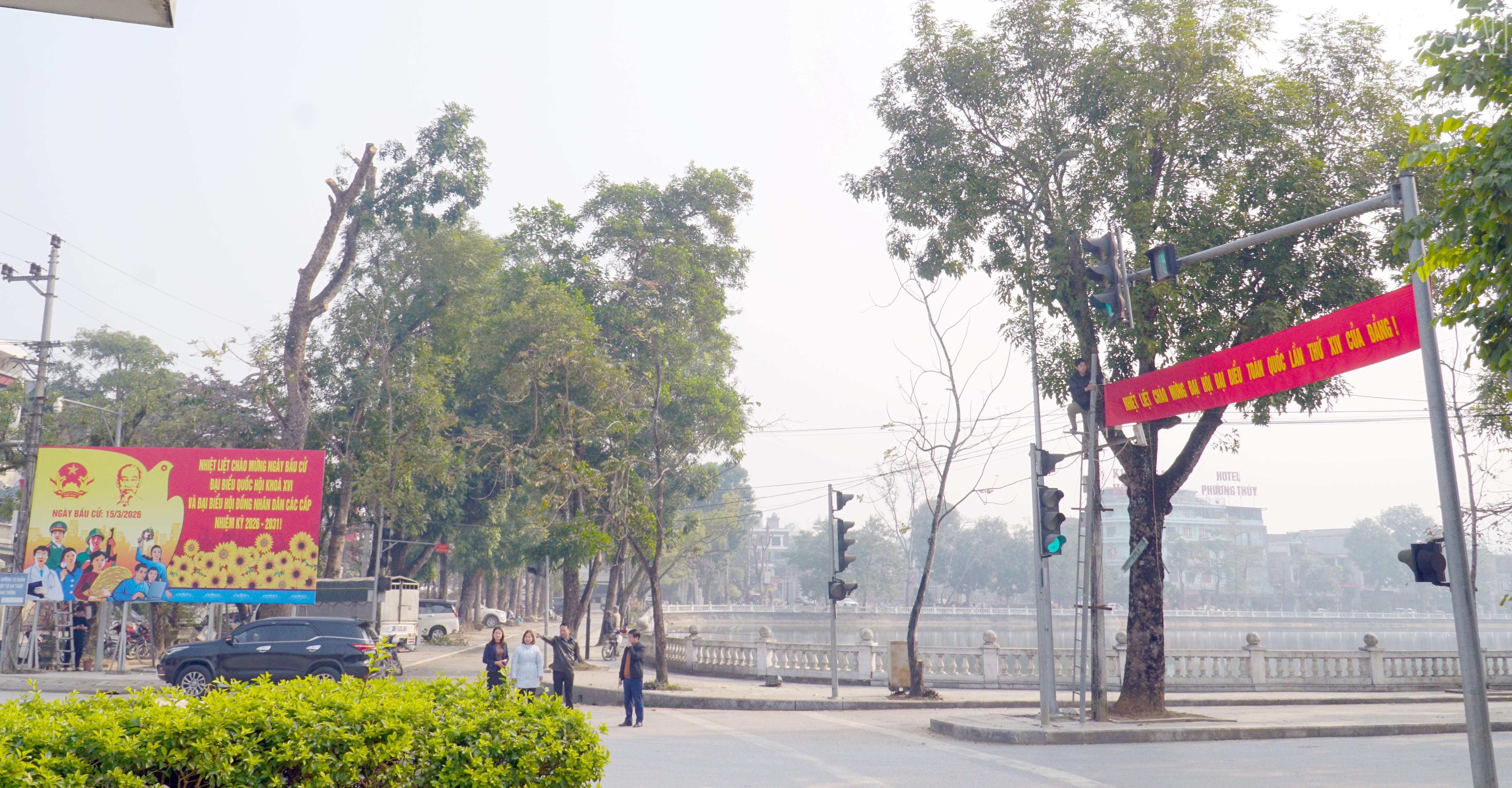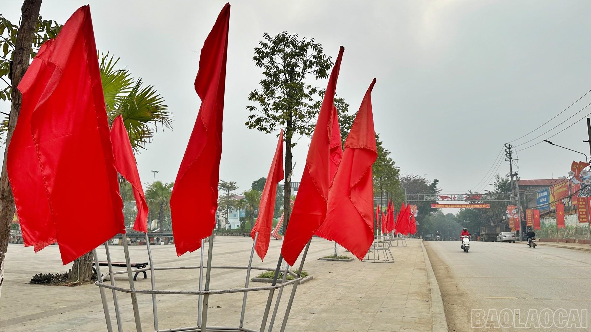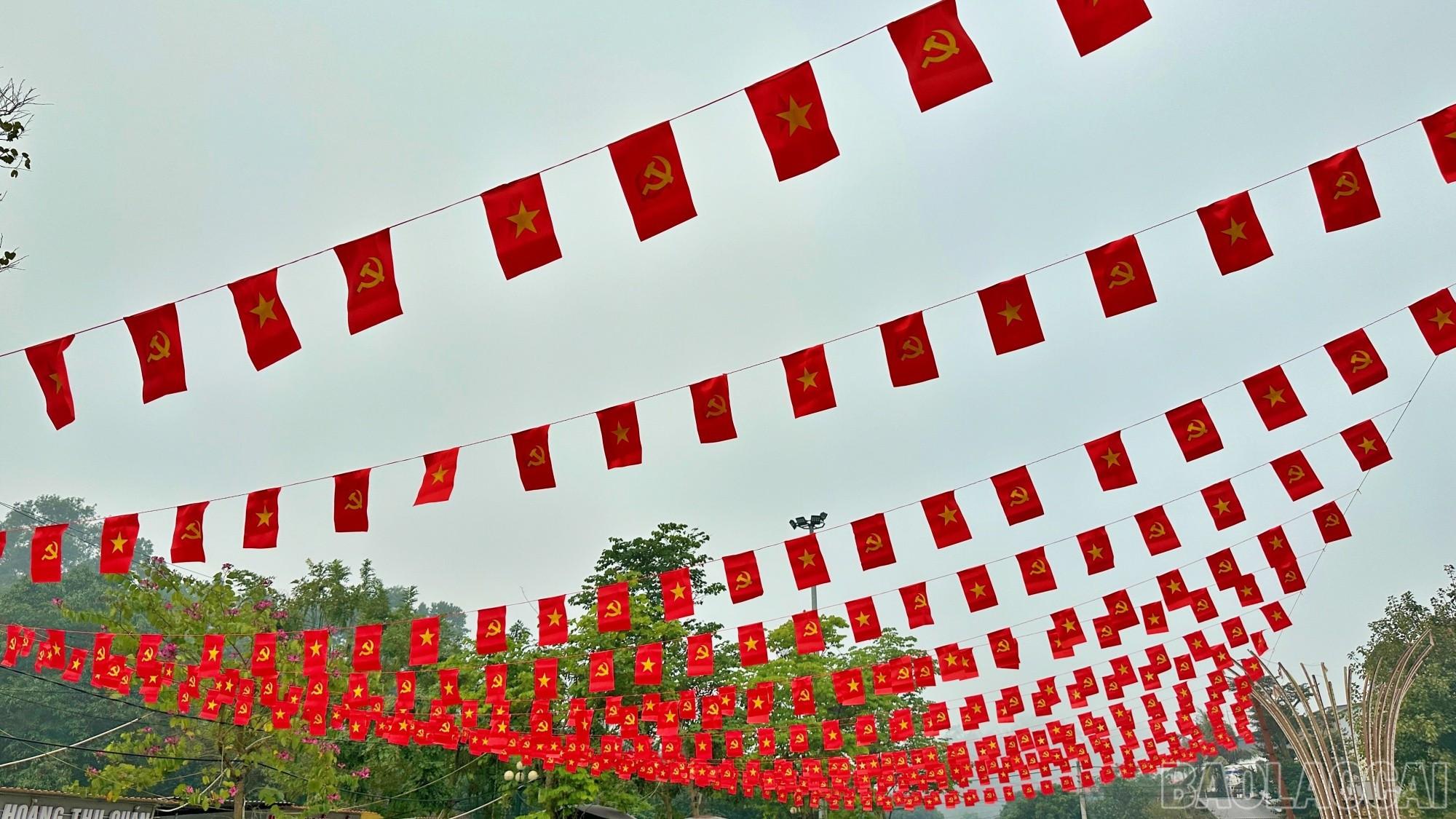 Trên các trục đường chính, cờ tổ quốc, băng rôn, khẩu hiệu được treo đồng loạt, tạo nên sắc đỏ rực rỡ chào mừng Đại hội.