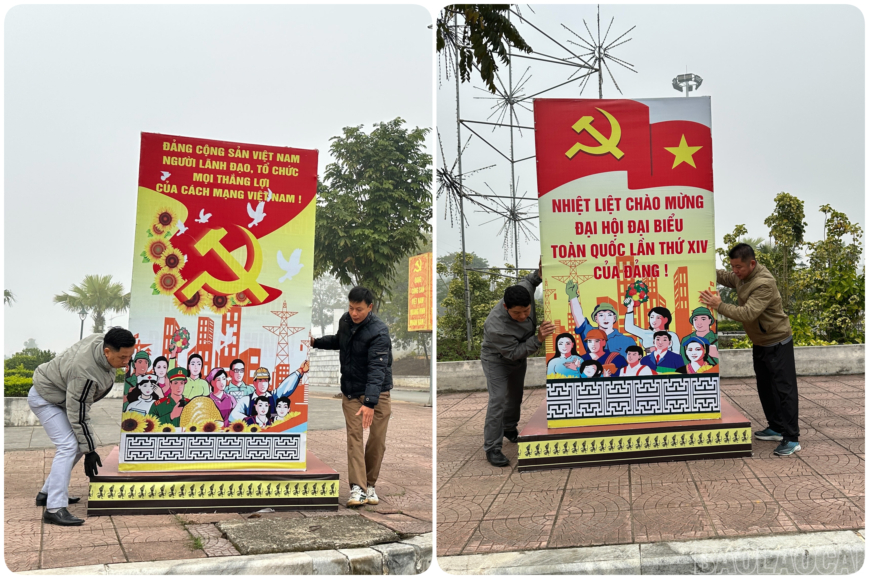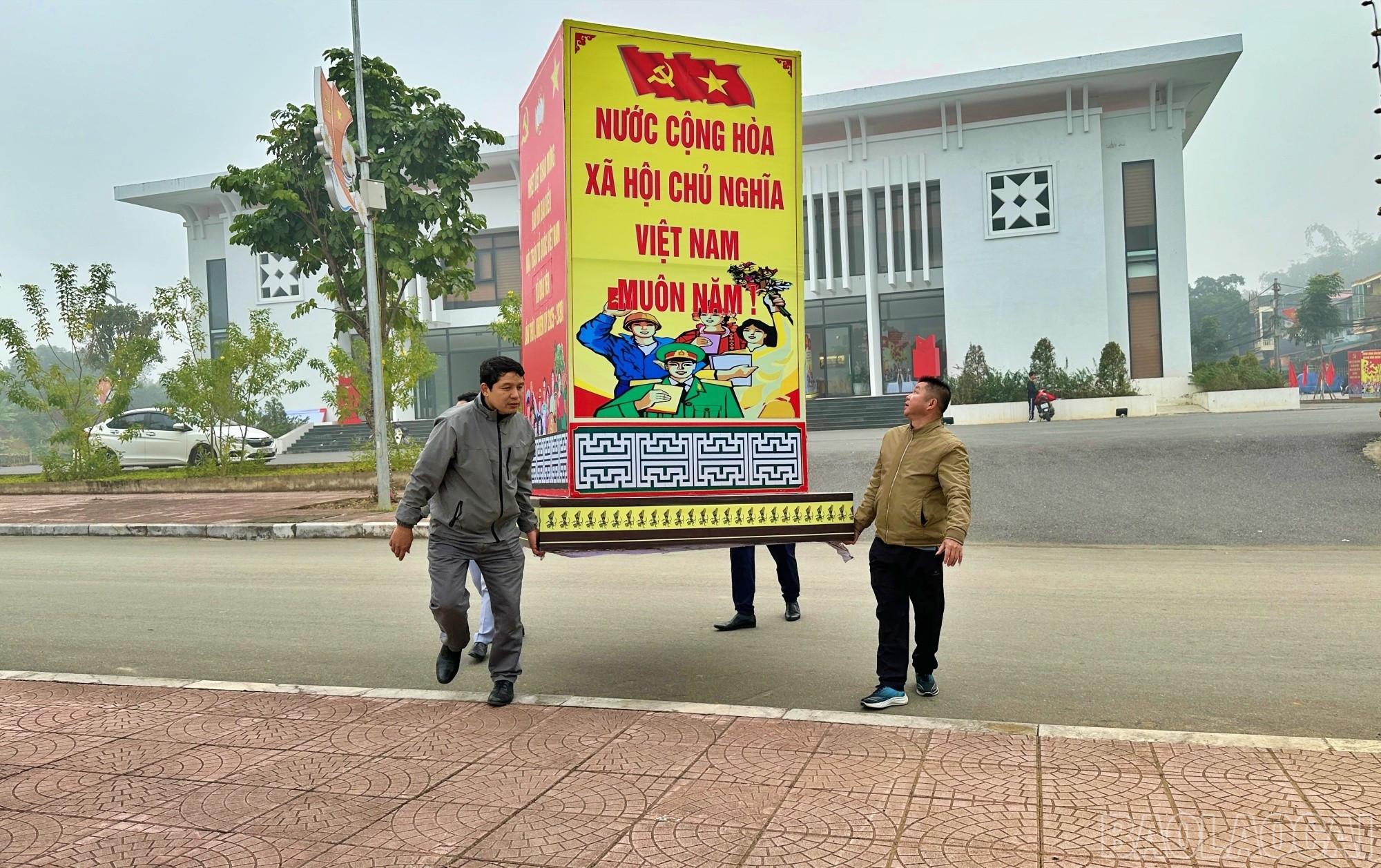 Tại khu vực tòa hợp khối hành chính xã, từ sáng 13/1, cán bộ, nhân viên Trung tâm Văn hóa, Thể thao và Truyền thông khu vực Bảo Yên đã khẩn trương lắp đặt các tổ cờ hồng kỳ, hộp pa nô tuyên truyền chào mừng Đại hội lần thứ XIV của Đảng.