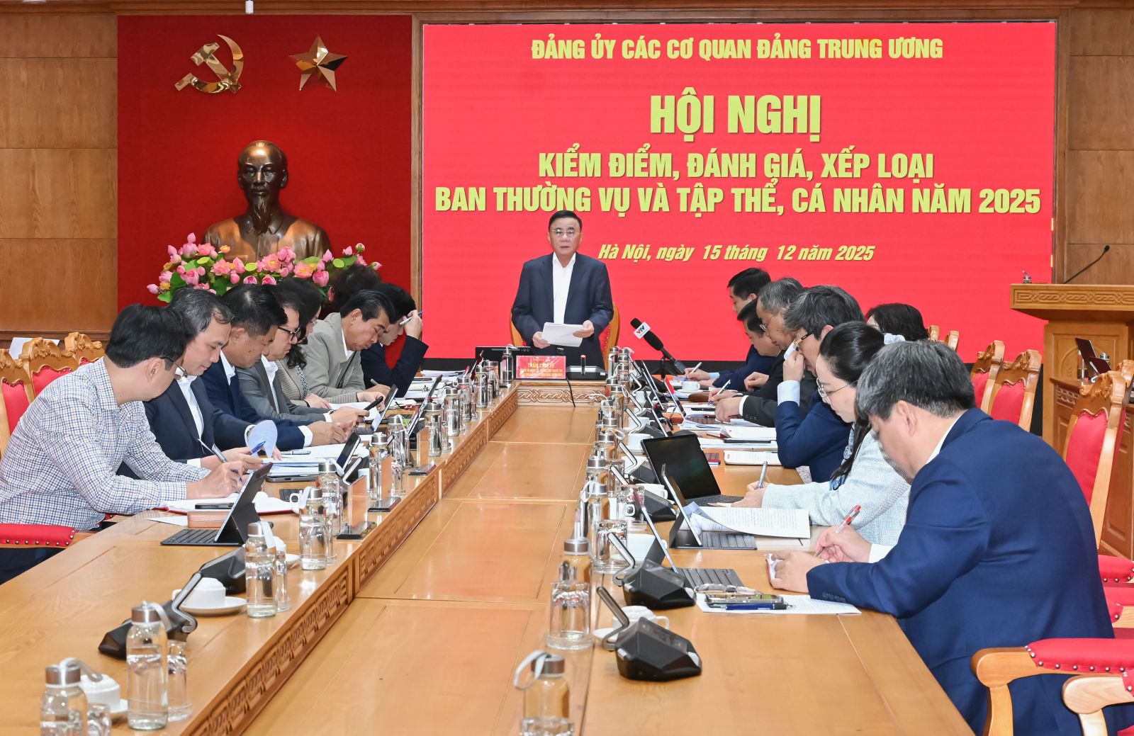 (ĐCSVN) - Sáng 15/12, Đảng ủy các cơ quan Đảng Trung ương tổ chức Hội nghị kiểm điểm, đánh giá, xếp loại Ban Thường vụ và tập thể, cá nhân năm 2025. Đồng chí Trần Cẩm Tú, Ủy viên Bộ Chính trị, Thường trực Ban Bí thư, Bí thư Đảng ủy các cơ quan Đảng Trung ương chủ trì Hội nghị.