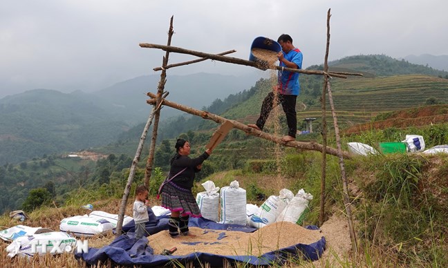 | Trên những thửa ruộng bậc thang Mù Cang Chải, người nông dân đã tiến hành thu hoạch. (Ảnh: Tuấn Anh/TTXVN) |