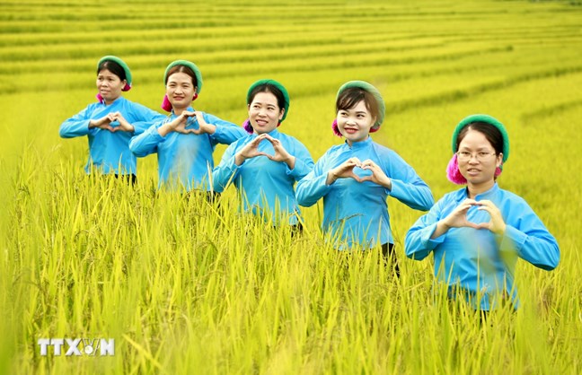 | Trên những thửa ruộng bậc thang Mù Cang Chải, người dân vui mừng khi lúa chín vàng rộ khắp các cánh đồng. (Ảnh: TTTXVN) |