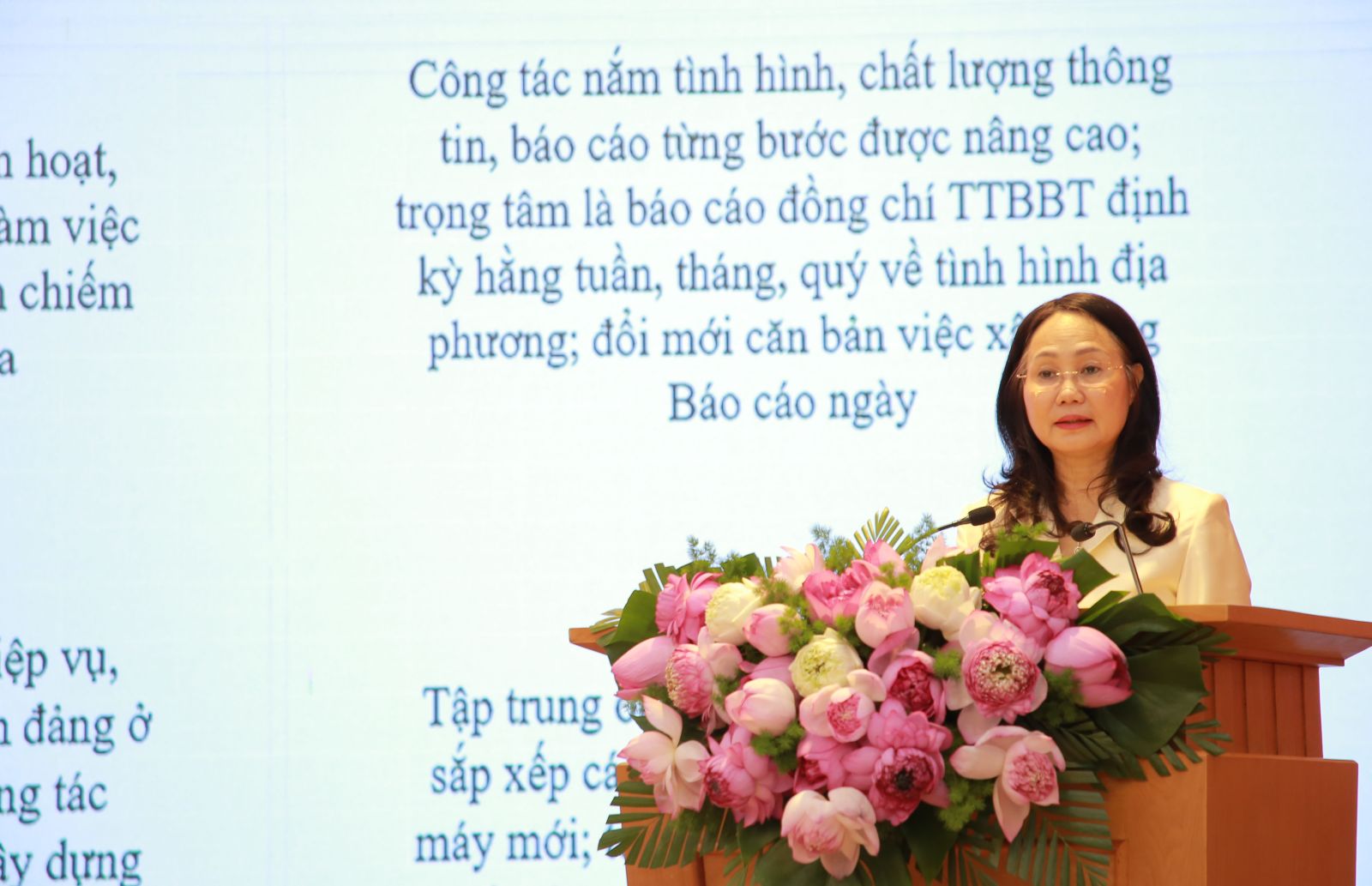 Về công tác tổ chức, đồng chí ghi nhận việc triển khai nghiêm túc và hiệu quả Nghị quyết số 18-NQ/TW, trong đó công tác sắp xếp lại tổ chức bộ máy, sáp nhập các đơn vị đã cơ bản hoàn tất. Các đơn vị mới từng bước đi vào hoạt động ổn định; đã xây dựng quy trình công tác, kiện toàn chức danh lãnh đạo, giải quyết cơ bản các vấn đề về nhân sự, tạo điều kiện để bộ máy hoạt động thông suốt...