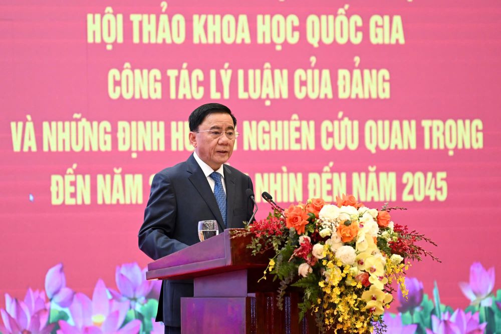 Đồng chí Trần Cẩm Tú, Ủy viên Bộ Chính trị, Thường trực Ban Bí thư phát biểu tại Hội thảo quốc gia: “Công tác lý luận của Đảng và những định hướng nghiên cứu quan trọng đến năm 2030, tầm nhìn đến năm 2045”. (Ảnh: Đình Quyết/Tạp chí Cộng sản).