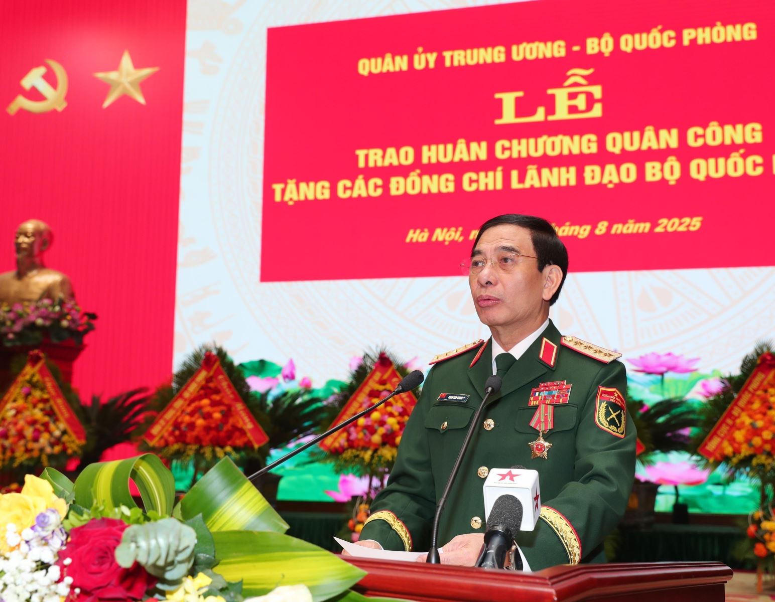 Thay mặt Quân ủy Trung ương, Bộ Quốc phòng, đồng chí Đại tướng Phan Văn Giang phát biểu chúc mừng các đồng chí được nhận Huân chương Quân công, những người đã có nhiều đóng góp đặc biệt xuất sắc trong sự nghiệp xây dựng quân đội, củng cố quốc phòng, xây dựng và bảo vệ Tổ quốc.