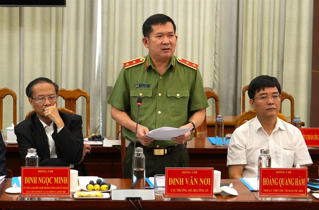 Đồng chí Đinh Văn Nơi, Cục trưởng A03, Bộ Công an trao đổi, thảo luận tại hội nghị.