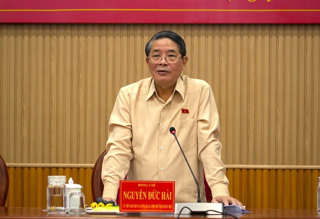 Đồng chí Nguyễn Đức Hải, Ủy viên Ban Chấp hành Trung ương Đảng, Phó Chủ tịch Quốc hội, Ủy viên Hội đồng Bầu cử Quốc gia phát biểu tại buổi làm việc.